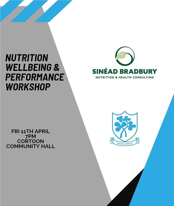 Cortoon Shamrocks GAA are delighted to welcome Sinèad Bradbury, Senior Performance Nutritionist, to Cortoon Community Hall this Friday the 11th of April at 7pm. Sinèad will be hosting a nutrition, wellbeing and performance workshop for our adult players.
