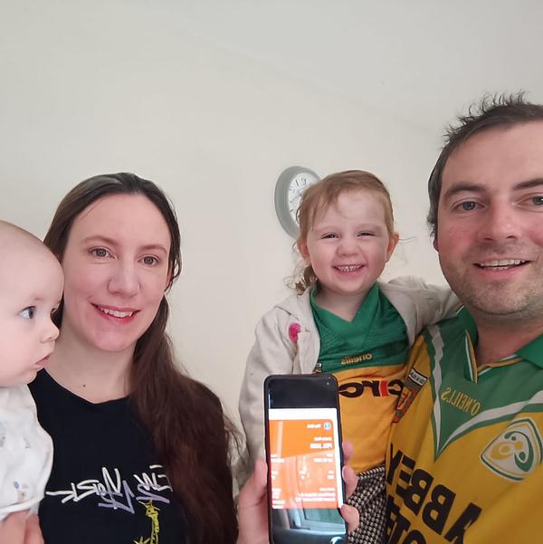 (Club Gaoth Dobhair) winner of the Cortoon Shamrocks GAA All-Ireland Football tickets with his family showing off their colors and winning tickets.
