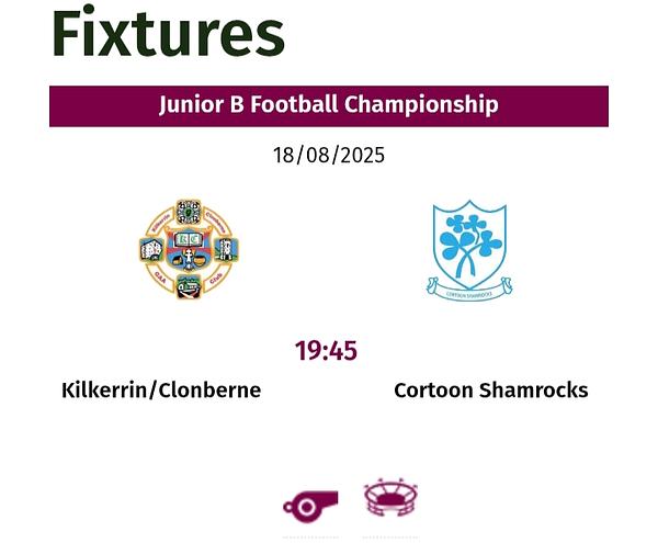 Junior game pushed out to 19:45 this evening (18 Aug 2025) against Kilkerrin/Clonberne