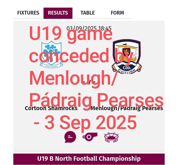 U19 game conceded by Menlough/Pádraig Pearses - 3 Sep 2025