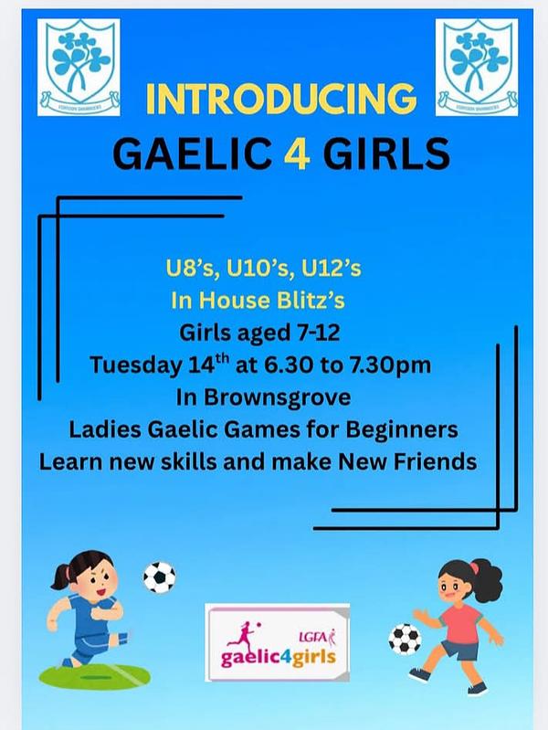 Introducing Gaelic 4 Girls, in house blitz for all girls aged 7-12, Tuesday 14th Oct from 6:30pm to 7:30pm in Brownsgrove community pitch. Learn new skills, make friends and have fun for all levels. Everyone is welcome to join in the fun. See you there...