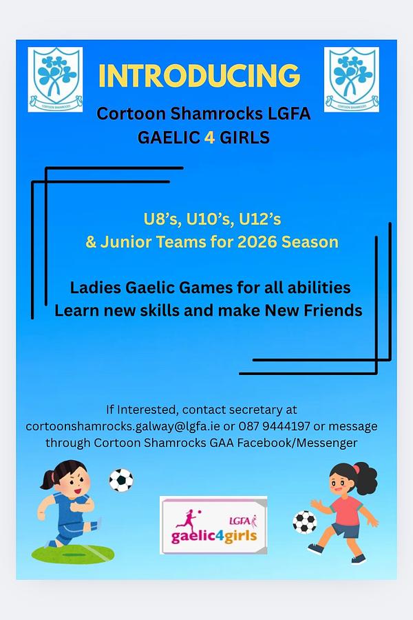 Looking to start the new year on the right foot, Cortoon GAA and LGFA are proud to announce that we are looking for all U8/U10/U12s and yes Junior females to join our LGFA. We will cater for all abilities in a friendly and fun environment with a keen sense of community and enjoyment. If you would be interested please reach out to any committee members of Cortoon GAA and LGFA, email to secretary at cortoonshamrocks.galway@lgfa.ie, text/message to 087-9444197 or message through Cortonn GAA & LGFA Facebook page.