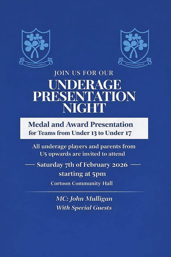 Join us for a medal and award presentation for teams from U13 to U17 on Sat. 7th February 2026, in Cortoon Community Hall starting at 5pm.